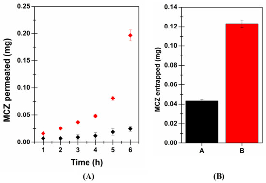 Figure 11, the cumulative amount of MCZ entrapped in the buccal tissue after 6 h of application is reported both as the amount (mg) (panel a) and percentage of the dose (panel b).