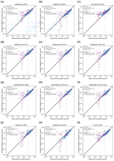 However, for the application of population pharmacokinetic models, an extensive assessment including internal and external evaluation regarding accuracy, robustness, and predictive performance is crucial []. While different methods have been applied in the respective internal model evaluations, only a fraction of the models has been evaluated with an independent data set [,,,,], and a comprehensive external evaluation for predictive model performances has not been conducted yet. External evaluation with an independent data set allows the evaluation of model performance regarding prediction and variability in patients with a clinical background similar to the internal data set and thus evaluates not only the modeling approach itself, but also other study-related factors [].