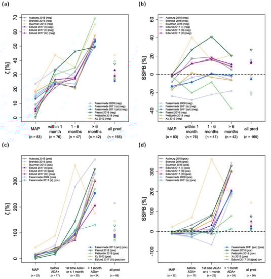 ζ values represent a measure of accuracy with smaller values indicating higher accuracy, while SSPB values represent a measure of bias with values closer to zero indicating less bias. Figure 2 shows the development of ζ and SSPB values over time for all included population pharmacokinetic models in the ADA negative (Figure 2a,b) and ADA-positive (Figure 2c,d) patient subpopulations. The last category (“all pred”) subsumes unstratified results for all predicted concentrations excluding CMAP. The corresponding ζ values were calculated for all 12 models to be within 26–44% (median: 30%) for ADA-negative patients and 77–215% (median: 92%) for ADA-positive patients. SSPB values for all models were within −22–27% (median: 6%) for ADA-negative patients and 8–145% (median: 43%) for ADA-positive patients.