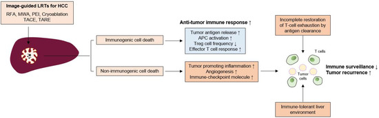 Insufficient immune surveillance after LRTs for HCC. Image-guided locoregional treatments (LRTs) such as radiofrequency ablation (RFA), microwave ablation (MWA), percutaneous ethanol injection (PEI), cryoablation, transarterial chemoembolization (TACE), and transarterial radioembolization (TARE) cause tumor-cell necrosis or apoptosis. LRT can induce immunogenic cell death, which can be characterized by increased tumor-antigen release, antigen presenting cell (APC) activation, and decrease of regulatory T (Treg) cell frequency. These phenomena result in the augmentation of anti-tumor T cell responses and tumor surveillance. However, LRT can also induce a non-immunogenic cell death, which increases the tumor-promoting inflammation, angiogenesis, and the expression of immune checkpoint molecules. Furthermore, incomplete T cell restoration despite antigen clearance and immune-tolerant liver environment might also affect the attenuation of immune surveillance; these factors might be associated with frequent tumor recurrence even after successful LRTs for HCC.