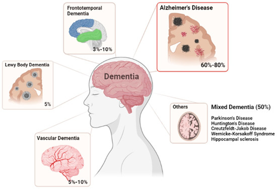 According to The World Health Organization, presently, dementia is the 7th largest cause of death in the world [1]. Dementia is a generic term used to designate a wide range of diseases, with Alzheimer’s disease (AD), Vascular Dementia, dementia with Lewy bodies, Frontotemporal Dementia and Parkinson’s Disease being the most relevant [2,3,4] (Figure 1). Dementia is usually associated with a group of symptoms affecting memory, thinking and social abilities, severe enough to interfere with daily life [5]. In general, the most characteristic symptoms, rarely treated or prevented efficiently are the deterioration of cognitive performance; behavioral disturbances; intellectual loss; difficulty in solving problems; loss of other cognitive skills affecting daily activities; and ultimately death [2,5,6,7,8]. Age is indicated as the biggest risk factor for the development of dementia. It is estimated that dementia affects approximately 47 million people worldwide and that by 2050, this number can reach about 131 [9]. The increased prevalence of these diseases is mainly associated with population aging, due to increased life expectancy. The number of people affected and the high impact that these diseases have on the quality of life are important arguments to make dementia treatment an attractive opportunity for pharmaceutical companies [5,10]. The World Health Organization has recognized AD as the most common and devastating form of dementia of our time, where two-thirds (50–75%) of the people affected can face death in approximately 8.5 years after the onset of symptoms [5,10]. AD is a multifactorial, progressive, chronic neurodegenerative disorder that occupies the 3rd place in the diseases that causes disability and death for the elderly, after cardiovascular/cerebrovascular diseases and malignant tumors [5,9,11]. It is estimated that about 31 million people have AD worldwide, and due to advances in healthcare, life expectancy has increased, which can contribute to the expected increase in AD cases in the next few years. Importantly, AD is also a comorbidity to other severe human diseases and is associated with high healthcare costs—it is estimated that the overall cost of health and social care could reach 2 trillion dollars by 2030 [9,10,12,13].