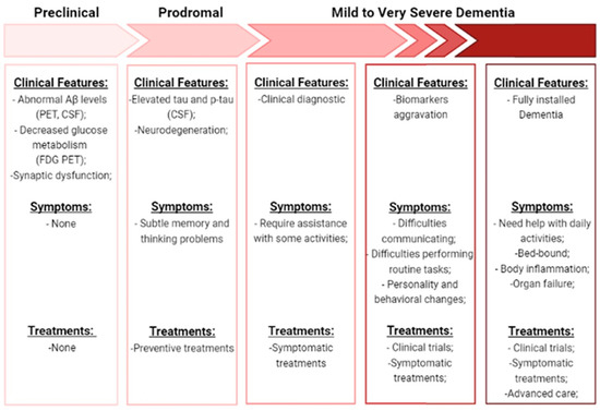 Description of the progression along the seven stages of AD. Is shown the clinical features, symptoms, and treatments specific to each stage. (Aβ—amyloid beta-peptide; PET—positron emission tomography; FDG—18F-fluorodeoxyglucose; CFS—Cerebrospinal fluid; p-Tau—phosphorylated-Tau).