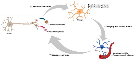 Overview of neuroinflammation, oxidative stress, and autophagy in AD. Representation of the consequences of Aβ plaque formation, namely, hyperphosphorylation of Tau protein, increased oxidative stress, inflammatory responses by microglia activation, damage to astrocytes, which lead to BBB disruption, causing cerebrovascular damage, dysfunction, and decreased autophagy.