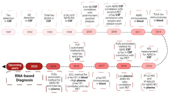 Biomarkers evolution in the diagnosis of Alzheimer’s disease. Evolution from the study of CSF biomarkers to the blood biomarkers, ending in the RNA research of today. CSF—cerebrospinal fluid; Aβ—amyloid beta-peptide; p-Tau—phosphor-Tau; PET—positron emission tomography; MS—mass spectrometry; IP-LC—immunoprecipitation liquid chromatography-mass spectrometry; IP-MALDI—immunoprecipitation matrix-assisted laser desorption/ionization; ECL—electrochemiluminescence.