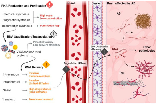In general, RNA-based therapies have been evolving in the last few years, both in AD and other diseases. However, there are still obstacles that must be overcome to achieve an effective and suitable therapy for human use. Thus, the production, purification, stabilization, and delivery of these biopharmaceuticals are the main points that need to be addressed and enhanced to reach that goal.