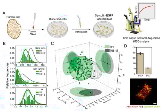 iMSD-based screening of ISGs structural and dynamic properties in dispersed human β-cells, as compared to immortalized INS-1E model. (A) Schematic representation of HI dispersion and transfection process. Forty-eight hours post-transfection, fluorescently labeled dispersed cells were observed with a confocal microscope to measure ISG structural-dynamic properties. (B) Distributions of the three iMSD relevant parameters (size, Dm and α) of n = 123 dispersed human islet cells (green curve and bars) compared with previous data retrieved from syncollin-EGFP labeled ISGs from INS-1E cells (grey curve and bars) (CIT). (C) Three-dimensional parametric plot showing the ‘fingerprint’ of syncollin-EGFP labeled ISGs (represented as 68% confidential ellipsoid) of human dispersed cells (green) and INS-1E (dark grey). (D) Exemplary image of a syncollin-EGFP (green) transfected dispersed islet cell immunostained with Alexa-541 Anti-insulin Ab (red). Scale bar: 5 μm. Column bars show the percentage of insulin-Ab positive (~75%) and Ab-negative in transfected cells (~25%) in n = 3 samples of dispersed human islets.