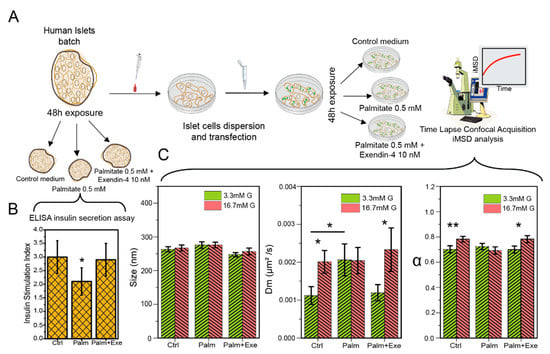 The effect of Exendin-4 on palmitate-treated dispersed human β-cells. (A) Workflow of the experimental procedure. Isolated human Langerhans islets were exposed for 48 h to control medium (Ctrl), 0.5 mM Palm and 0.5 mM Palm + 10 nM Exe-4 and then tested for insulin secretion. In a parallel set of experiments, HI from the same donor were dissociated and transfected with Syncollin-EGFP plasmid in order to label ISGs. Dispersed cells were exposed for 48 h to conditions described above, then fluorescently labeled ISGs’ structural and dynamic properties were evaluated in a confocal microscope experiment. (B) Insulin stimulation index measured with ELISA kit assay for intact islets exposed to control medium, Palm and Palm + Exe-4. (* p < 0.05). (C) iMSD derived parameters (size, Dm and α) were measured in a low (3.3 mM) glucose concentration and after stimulation with high (16.7 mM) glucose in Ctrl, Palm and Palm + Ex-4 treated cells. Data represented as Mean ± SE (* p < 0.05, ** p < 0.01—t-test). ‘Ctrl’: control medium; ‘Palm’: 0.5 mM palmitate; ‘Palm + Exe’: 0.5 mM palmitate + 10 nM Exendin-4.