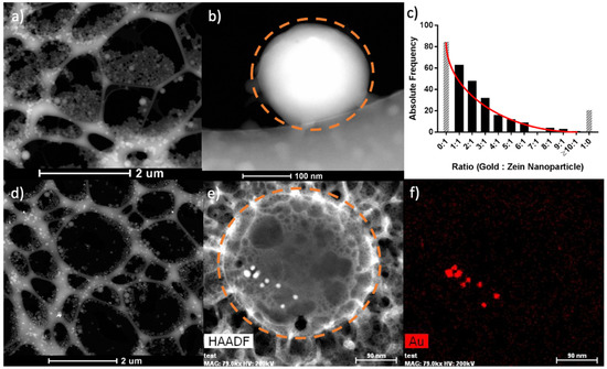 Representative electron microscopy images of Zein nanoparticles (ZNPs) and Zein–gold hybrid nanoparticles (ZAuNPs) and the number of associated gold nanoparticles identified per ZAuNP. (a) A low-magnification dark field scanning transmission electron microscopy image of Zein NPs. (b) A high-magnification dark field scanning transmission electron microscopy image of a Zein NP. The dashed orange line indicates the outline of the ZNP. (c) A graph depicting the number of gold nanoparticles associated per ZAuNP. The black bars represent hybrids, while the gray hashed bars represent either Zein- or gold-only nanoparticles. (d) A low-magnification dark field scanning electron microscopy image of ZAuNPs. (e) A high-magnification dark field scanning electron microscopy image of ZAuNPs. The dashed orange line indicates the outline of the ZAuNP. (f) An energy-dispersive X-ray spectroscopy image of (e), confirming the presence of gold nanoparticles.