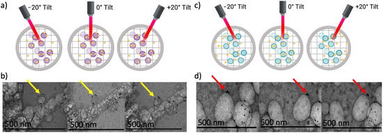 Tilting of the sample in cryogenic transmission electron microscopy (Cryo-TEM) to determine the association of particles. (a) A schematic of how hybrid particles would appear at each tilting angle used for the Cryo-TEM. (b) Cryo-TEM depicting gold nanoparticles (black) continuing to associate with Zein nanoparticles (dark grey) as the sample was tilted at −20°, 0°, and +20°, from left to right. (c) A schematic of how nonassociated particles would appear when the particles will not remain associated when changing the tilting angle. (d) Cryo-TEM depicting gold nanoparticles (black) disassociating with a bubble (light grey) as the sample is tilted at −20°, 0°, and +20°, from left to right.