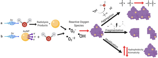 One of the major effects of radiation is reactive oxygen species (ROS) generation through the radiolysis of water. The addition of gold, such as in AuNPs, which is electron dense, can enhance interactions with ionizing radiation. This ultimately leads to a greater production of ROS [4]. While ROS enhancement has been extensively studied with AuNPs, the lifespan of some of the ROS species is extremely short, making it difficult to track the process in real time when using complex samples [13]. However, physical and chemical characterization of the protein could alternatively reveal the possible downstream effects of such interactions. Figure 4 highlights some of the known assessable consequences of ROS interactions with proteins, including aggregation, fragmentation, and chemical modification (such as changes in aromaticity and hydrophobicity), which have been extensively used to characterize protein–radiation interactions [14,15,16,17,18]. These downstream effects were further probed using UV–vis, DLS, SDS-PAGE, and EM in our system.