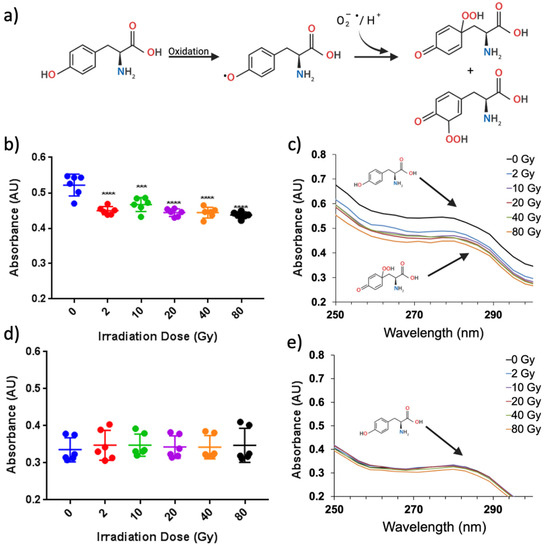 Suggested damage to the aromatic groups for irradiated Zein hybrid particles only: (a) a schematic illustration of a chemical reaction on the amino acid tyrosine adapted from Davies [23] which can undergo further reactions; (b) OD 280 nm of Zein–gold hybrid nanoparticles at varying irradiation doses; (c) representative absorbance spectra of Zein–gold hybrid nanoparticles at each dose in (b); (d) OD 280 nm of Zein nanoparticles at varying irradiation doses; (e) representative absorbance spectra of Zein nanoparticles at each dose in (d). *** p < 0.001, **** p < 0.0001.