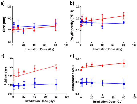 Characteristics of Zein-only nanoparticles (ZNPs; blue squares) and Zein–gold hybrid nanoparticles (ZAuNPs; red circles) at varying X-ray doses: (a) the size of ZNPs and ZAuNPs (dynamic light scattering results); (b) the polydispersity of ZNPs and ZAuNPs; (c) the level of aggregation of ZNPs and ZAuNPs (SDS-PAGE results); (d) the turbidity of ZNPs and ZAuNPs.