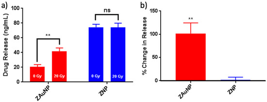 Irinotecan release of Zein nanoparticle (ZNP) and Zein–gold nanoparticle hybrid (ZAuNP) 50 µg/mL formulations. (a) Concentration of drug release of ZNP (blue) and ZAuNPs (red) before (left bar graph) and after (right bar graph) exposure to 20 Gy. (b) Percent change in Irinotecan release for ZNP and ZAuNP samples when exposed to 20 Gy. ** p < 0.01, ns for non-significant.