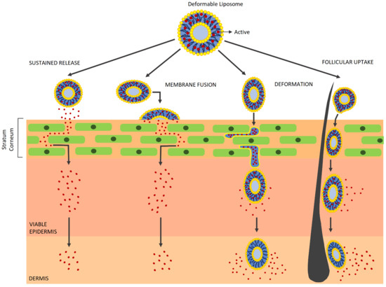 A well-known exception to this rule can be found in deformable liposomes (i.e., transferosomes and ethosomes), in which surfactants and/or ethanol act as edge activators, allowing the vesicles to deform throughout the stratum corneum matrix. However, it is difficult to discriminate between their main claimed property and other simultaneous permeation mechanisms (Figure 3) [31,32]. IDEA AG holds the first international patents (1991 and later) that cover preparations based on such amphipathic aggregates, including those containing alcohols, which are mainly used for drug-delivery purposes [68]. Nonetheless, they can also be employed for cosmetic purposes [72]. Some marketed products are also based on ethosomes [73,74,75,76].