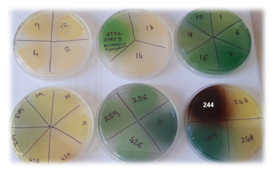 Colors of colonies of P. putida 262 clinical isolate producing pyoverdine.