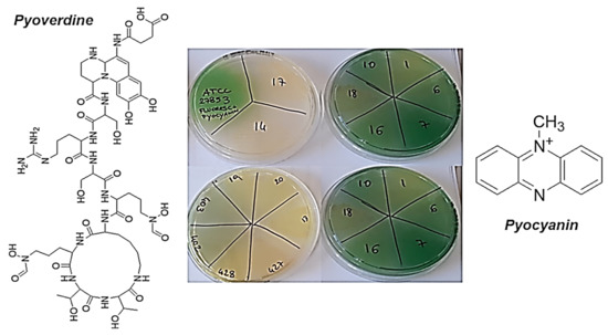 - Meyer, J.M. Pyoverdines: Pigments, siderophores and potential taxonomic markers of fluorescent Pseudomonas species. Arch. Microbiol. 2000, 174, 135–142. [Google Scholar] [CrossRef] [PubMed]