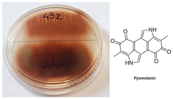 - Ogunnariwo, J.; Hamilton-Miller, J.M.T. Brown- and Red-Pigmented Pseudomonas Aeruginosa: Differentiation Between Melanin and Pyorubrin. J. Med. Microbiol. 1975, 8, 199–203. [Google Scholar] [CrossRef] [Green Version]