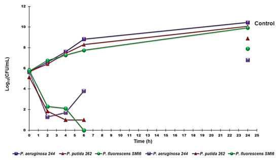 Time-killing curves performed with G5-PDK (at concentrations equal to 4 × MIC) on P. aeruginosa 244, P. fluorescens SMI6, and P. putida 262.