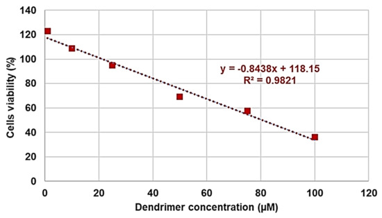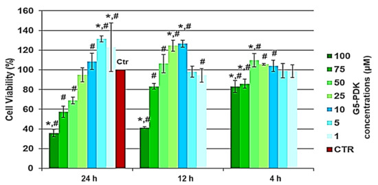 The cytotoxic activity of G5-PDK, as a function of its concentrations (1–100 µM), was determined after 4, 12, and 24 h of exposure of the cells. The results are reported in Figure 6.