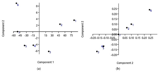 Figure 7 shows the PCA results obtained working on the data set corresponding to 24 h of exposure. Specifically, Figure 7a shows the PCA results as scores on PC1 vs. PC2, while Figure 7b shows the results as scores on PC2 vs. PC2. Similarly, we also processed the data set corresponding to 12 h of exposure, and the PCA results are available in SI (Section S3, Figure S3—SM).