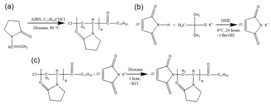 A maleimide group was attached to the synthesized homopolymer by reacting an amphiphilic N-vinyl-2-pyrrolidone homopolymer containing chlorine at the end of the hydrophilic chain (Amph-PVP-Cl) with potassium maleimide. The polymer with a maleimide active group was synthesized in the dioxane medium as follows: dry dioxane, the Amph-PVP-Cl polymer, and potassium maleimide (with a molar excess of 1.1) were stirred at room temperature for 1 h, diluted with distilled water, dialyzed against water for 3 days and lyophilized.
