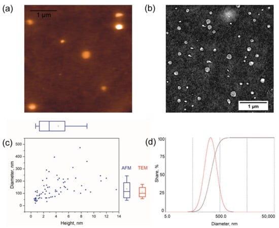 The P-DR5-B nanoparticles were visualized by atomic force microscopy and transmission electron microscopy (Figure 2a,b, respectively). Using both imaging techniques, we observed the round-shaped nanoparticles. We used carbon-coated mica as a substrate for the AFM imaging because upon the glow discharge treatment, it provided better sample adsorption than the other commonly used substrates (e.g., mica or Ni+2-treated mica). The low height of the nanoparticles (typically below 15 nm) indicated severe flattening, as commonly observed with AFM. The diameters of individual nanoparticles measured by AFM and TEM were in good agreement, namely, the means were DAFM = 140 ± 90 nm and DTEM = 110 ± 50 nm (Figure 2c) and in a reasonable agreement with the DLS data. The median hydrodynamic size of the P-DR5-B nanoparticles measured by DLS was about 220 nm (Table 1, Figure 2d). The difference between the sizes calculated using microscopy and DLS could arise due to the sample polydispersity and the relatively low sensitivity of DLS towards the small nanoparticles.