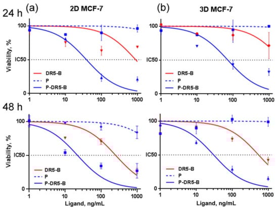 Cytotoxicity of the P-DR5-B nanoparticles in (a) 2D and (b) 3D human tumor models of breast adenocarcinoma MCF-7 in vitro for 24 and 48 h. Cell viability was determined by the MTT test. Mean ± Standard Deviation (n = 3).