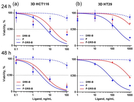 Therefore, the further cytotoxicity study of the P-DR5-B nanoparticles for HCT116 and HT29 cells were carried out only in the 3D model (Figure 4), since the spheroids are considered as a more relevant model than monolayer culture due to better mimicking small solid tumors in vivo [32]. The P-DR5-B nanoparticles were found to surpass free DR5-B in cytotoxicity in all tested models. However, the advantage of P-DR5-B nanoparticles was more pronounced for the spheroids from DR5-B-resistant HT29 and MCF-7 cells (Figure 3b and Figure 4b, Table 2), while in the case of the spheroids from DR5-B-sensitive HCT116 cells the cytotoxicity of the P-DR5-B nanoparticles was comparable to that of free DR5-B (Figure 4a, Table 2). The cytotoxic effect was time-dependent, increasing from 24 to 48 h of incubation (Figure 3 and Figure 4, Table 2). Thus, conjugation of DR5-B to the nanoparticles resulted in an enhanced cell-killing capacity. The values of the standard error of the regression (S) for IC50 calculations are shown in Table S1.