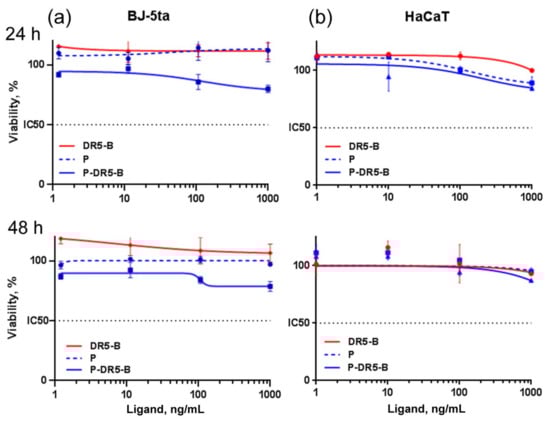 Cytotoxicity of the P-DR5-B nanoparticles in normal BJ-5ta (a) and HaCaT (b) cell lines after 24 and 48 h. Cell viability was determined by the MTT-test. Mean ± Standard Deviation (n = 3).