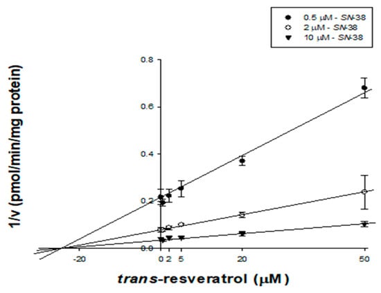 Representative Dixon plot obtained from an inhibition kinetic study of UGT1A1-mediated SN-38 glucuronidation in the presence of different concentrations of trans-resveratrol in pooled human liver microsomes (n = 3). An increasing concentration of SN-38 (0.5 (⬤), 2.0 (◯), and 10 μM (▼)) was incubated with HLMs (0.25 mg/mL) and UDPGA (1 h, 37 °C) in the presence or absence of trans-resveratrol (0, 0.5, 2.0, 5.0, 20, and 50 μM).