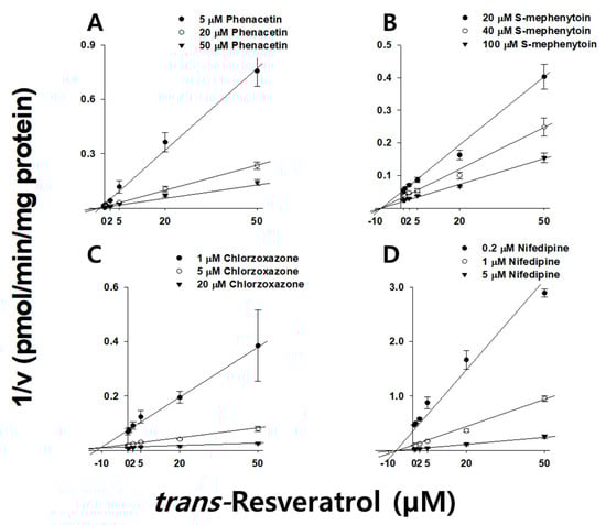 Representative Dixon plots obtained from inhibition kinetic studies of CYP1A2-mediated phenacetin O-deethylation (A); CYP2C19-mediated S-mephenytoin 4-hydroxylation (B); CYP2E1-mediated chlorzoxazone 6-hydroxylation (C), and CYP3A-mediated nifedipine dehydrogenation (D) in the presence of different concentrations of trans-resveratrol in pooled human liver microsomes (n = 3). Each trans-resveratrol (0, 0.5, 2.0, 5.0, 20, and 50 μM) was pre-incubated with HLMs in the presence of an NADPH-generating system (30 min, 37 °C), and then an increasing concentration of phenacetin (5 (⬤), 20 (◯), and 50 μM (▼)), S-mephenytoin (20 (⬤), 40 (◯), and 100 μM (▼)), chlorzoxazone (1 (⬤), 5 (◯), and 20 μM (▼)), and nifedipine (0.2 (⬤), 1 (◯), and 5 μM (▼)) was added prior to further incubation for 10 min.