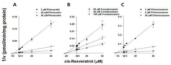 Representative Dixon plots obtained from an inhibition kinetic study of CYP1A2-mediated phenacetin O-deethylation (A); CYP2C19-mediated S-mephenytoin 4-hydroxylation (B), and CYP2E1-mediated chlorzoxazone 6-hydroxylation (C) in the presence of different concentrations of cis-resveratrol in pooled human liver microsomes (n = 3). Each cis-resveratrol (0, 0.5, 2.0, 5.0, 20, and 50 μM) was pre-incubated with HLMs in the presence of an NADPH-generating system (30 min, 37 °C), and then an increasing concentration of phenacetin (5 (⬤), 20 (◯), and 50 μM (▼)), S-mephenytoin (20 (⬤), 40 (◯), and 100 μM (▼)), and chlorzoxazone (1 (⬤), 5 (◯), and 20 μM (▼)) added before further incubation for 10 min.