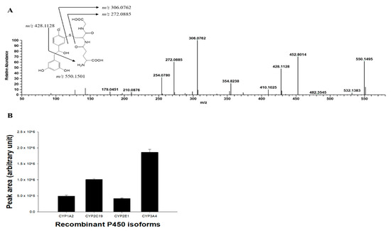 Using a Vanquish HPLC combined with a QExactive Focus Orbitrap mass spectrometer (Thermo Fisher Scientific Inc., Waltham, MA, USA), we determined the glutathione adducts produced by rP450s. A Kinetex C18 column was also used to separate the analytes. The mobile phase was set as 80% acetonitrile in water containing 0.1% FA. The flow rate was set at 0.2 mL/min. Data acquisition was carried in the total ion scan mode (m/z 100–700) with a resolution of 70,000, and MS/MS spectra were acquired in the product ion scan mode (m/z 50–580) at a resolution of 17,500. Parallel reaction monitoring (PRM) conversion m/z 550.1495 was used for the identification of GSH conjugate.
