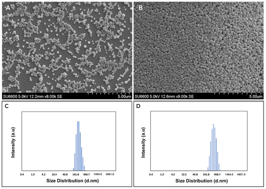 (A,B) SEM image of curcumin-Bioperine PLGA NPs 1:0.2:10 and 1:1:10 (at scale 5.00 μm). (C,D) Size distribution of curcumin-Bioperine PLGA NPs 1:0.2:10 and 1:1:10, respectively.