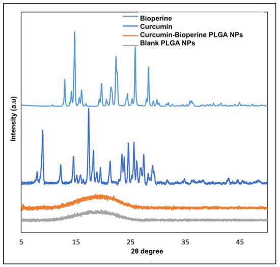 XRD spectra of free Bioperine, free curcumin, curcumin-Bioperine PLGA NPs, and blank PLGA NPs.