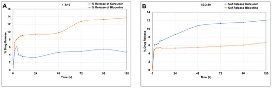 In vitro drug release of curcumin and Bioperine from the curcumin-Bioperine PLGA NPs (A) 1:1:10 and (B) 1:0.2:10 at pH 7.4 PBS buffer 37 °C for 5 days.