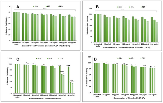 (A) % Relative cell viability of THP-1 monocyte-derived macrophage cells when treated with 1:0.2:10 ratio curcumin-Bioperine PLGA NPs for 24–72 h. (B) % Relative cell viability of THP-1 monocyte-derived macrophage cells when treated with 1:1:10 ratio curcumin-Bioperine PLGA NPs for 24–72 h. (C) % Relative cell viability of THP-1 monocyte-derived macrophage cells when treated with curcumin PLGA NPs for 24–72 h. (D) % Relative cell viability of THP-1 monocyte-derived macrophage cells when treated with Bioperine PLGA NPs for 24–72 h. (All the data for cell viability studies are expressed as the mean ± S.E.M. Unpaired Student’s t-test was performed to check the statistical significance of the investigation using GraphPad Prism software. Data were considered significant when p < 0.05. Untreated samples were taken as controls). The ratios of curcumin-Bioperine PLGA NPs at all doses and time points demonstrated that the experiment was extremely statistically significant, with p < 0.05 (* p ≤ 0.05 ** p ≤ 0.01 *** p ≤ 0.001 **** p ≤ 0.0001).
