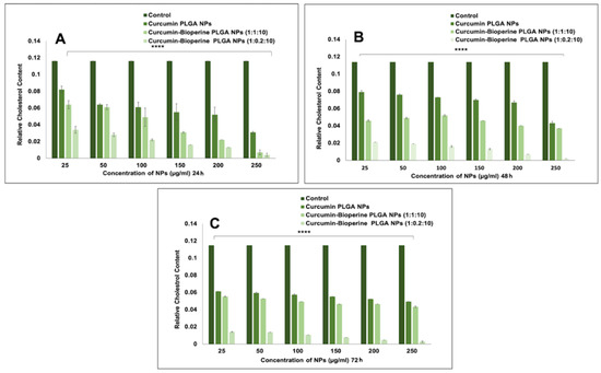 Relative cholesterol content of THP-1 monocyte-derived macrophage cells when treated with curcumin PLGA NPs, and both the ratios of curcumin-Bioperine PLGA NPs (1:1:10 and 1:0.2:10) for (A) 24 h (B) 48 h and (C) 72 h. (All the data for cholesterol quantitation studies are expressed as the mean ± S.E.M. Unpaired Student’s t-test was performed to check the statistical significance of the investigation using GraphPad Prism software. Data were considered significant when p < 0.05. Untreated samples were taken as controls). The cholesterol quantitation experiment demonstrated extremely statistically significant results, with p < 0.05 (**** p = 0.0001).