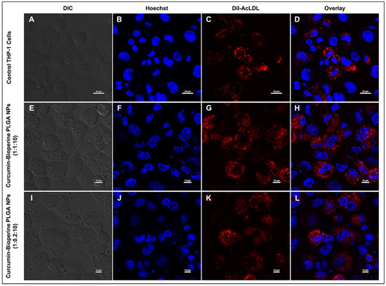 Confocal laser scanning microscopy analysis shows the Dil-AcLDL staining on THP-1 monocyte-derived macrophage cells to check the inhibition of foam cell formation. THP-1 monocyte-derived macrophage cells are pre-incubated with Dil-AcLDL for 4 h, followed by the treatment with both the ratios of curcumin-Bioperine PLGA NPs (1:1:10 and 1:0.2:10) for 24 h. The top panel (A–D) shows the control THP-1 monocyte-derived macrophage cells forming foam cells (scale bar 20 μm). The second panel (E–H) shows the THP-1 monocyte-derived macrophage foam cells treated with curcumin-Bioperine PLGA NPs 1:1:10 (Scale bar 10 μm). The third panel (I–L) shows the THP-1 monocyte-derived macrophage foam cells treated with curcumin-Bioperine PLGA NPs 1:0.2:10 (scale bar 10 μm).