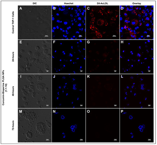 Confocal laser scanning microscopy analysis shows the Dil-AcLDL staining on THP-1 monocyte-derived macrophage cells to check the inhibition of foam cell formation. THP-1 monocyte-derived macrophage cells were pre-treated with curcumin-Bioperine PLGA NPs (1:1:10) for 24–72 h, followed by incubation of Dil-AcLDL for 4 h. The top panel (A–D) shows the control THP-1 monocyte-derived macrophage cells forming foam cells (Scale bar 20 μm). The second panel (E–H), third panel (I–L), and fourth panel (M–P) show the inhibition of foam cell formation upon treated with curcumin-Bioperine PLGA NPs 1:1:10 for 24–72 h (scale bar 10 μm).
