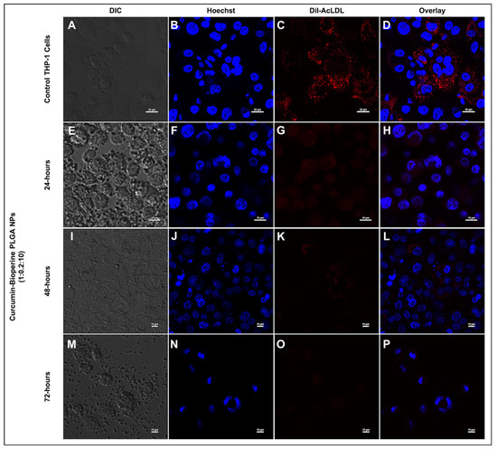 Confocal laser scanning microscopy analysis shows the Dil-AcLDL staining on THP-1 monocyte-derived macrophage cells to check the inhibition of foam cell formation. THP-1 monocyte-derived macrophage cells are pre-treated with curcumin-Bioperine PLGA NPs (1:0.2:10) for 24–72 h, followed by incubation of Dil-AcLDL for 4 h. The top panel (A–D) shows the control THP-1 monocyte-derived macrophage cells forming foam cells (Scale bar 20 μm). The second panel (E–H), third panel (I–L), and fourth panel (M–P) show the inhibition of foam cell formation upon being treated with curcumin-Bioperine PLGA NPs 1:0.2:10 for 24–72 h (scale bar 10 μm).