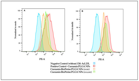 As we have already established from our confocal microscopy results that both the ratios of Cur-Bio PLGA NPs (1:1:10 and 1:0.2:10) at 250 µg/mL are effective in inhibiting the Dil-AcLDL uptake by the THP-1 monocyte-derived macrophage cells within 24–48 h, we decided to study the internalization of the Dil-AcLDL by the macrophage cells using flow cytometry analysis. THP-1 monocyte-derived macrophages were pre-treated with the Cur-Bio PLGA NPs at both ratios at 250 μg/mL for 24–48 h, followed by incubation with Dil-AcLDL for 4 h to analyze the reduction in the LDL uptake. Inhibition of forming foam cells by curcumin is due to the downregulation of CD-36-mediated Ox-LDL uptake [51] and upregulation of ABCA1-dependent cholesterol efflux [57], as reported previously. Flow cytometry analysis revealed that during 24–48 h of treatment with the Cur-Bio PLGA NPs, both 1:1:10 and 1:0.2:10 ratios displayed a similar reduction in the Dil-AcLDL uptake as shown in Figure 9A,B. As evident from our confocal microscopy results that suggest reduced Dil-AcLDL uptake by the THP-1 monocyte-derived macrophage cells from 24–48 h, the flow cytometry analysis also revealed comparable results, showing that both the ratios of Cur-Bio PLGA NPs could block the internalization of Dil-AcLDL by the macrophages within 24–48 h. Notably, even though both the ratios of Cur-Bio PLGA NPs have different concentrations of Bioperine encapsulated inside PLGA NPs, their bio-enhancing capacity was not altered, which helped curcumin to carry out the designated functions of reducing plaque formation in atherosclerosis. Cur-PLGA NPs were used as a positive control and were observed to have an increased uptake of Dil-AcLDL by the THP-1 monocyte-derived macrophage cells compared to the Cur-Bio PLGA NPs, thus suggesting that Bioperine increases curcumin efficacy in minimizing the Dil-AcLDL uptake in THP-1 monocyte-derived macrophage cells.