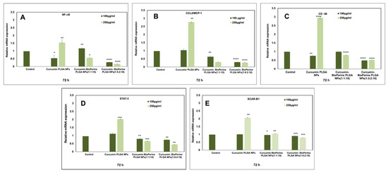 Relative mRNA expression of NF-κB, CCL2/MCP-1, CD-36, STAT-3, and SCAR-B1 in THP-1 monocyte-derived macrophage cells after treatment with curcumin-Bioperine PLGA NPs (1:1:10 and 1:0.2:10) and Cur-PLGA NPs for 72 h. Both the ratios of curcumin-Bioperine PLGA NPs (250 μg/mL) demonstrated downregulation of (A) NF-κB, (B) CCL2/MCP-1, (C) CD-36, (D) STAT-3 and upregulation of (E) SCAR-B1 compared to 100 μg/mL. All the data were normalized to GAPDH mRNA expression using the ΔΔCt method. (All the data for gene expression studies are expressed as the mean ± S.E.M. Unpaired Student’s t-test was performed to check the statistical significance of the investigation using GraphPad Prism software. Data were considered significant when p < 0.05 (* p ≤ 0.05 ** p ≤ 0.01 *** p ≤ 0.001 **** p ≤ 0.0001). Untreated samples were taken as controls.