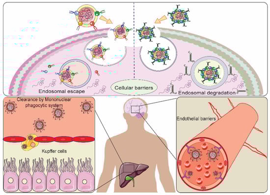 Graphic depiction of major barriers obstructing the nano delivery system (NDS), such as the endosomal–lysosomal system, clearance of NDS via the mononuclear phagocytic system, and endothelial barrier acting in the event of extravasation of NDS in cancer.