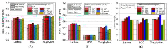 In case of bulk and tap densities of the raw and ground powders (Figure 10), small additive effects can be identified, especially for the raw materials. For each of the three materials, a slight increase of both powder densities can be seen for the lubricant SSF, and also partially for the other additives. The relative differences between bulk and tap density stay mostly in a comparable range. Thus, the corresponding Carr’s indices indicate that the compressibility of the raw powders is not significantly influenced by adding any of the additives (Figure 10C). Independent of the additive, a material-specific change of the Carr’s index can be observed during grinding. Especially for lactose, grinding leads to an increase of the Carr’s index, independent of the additive, and thus to a higher compressibility of the powder. This is in good accordance with the highly decreased flowability of lactose due to grinding. Furthermore, the observed additive effects almost vanish as a consequence of the micronization. Significant additive effects are only seen partially for any of the ground materials. For instance, Aerosil in general or PEG admixed to theophylline show slightly higher and lower Carr’s indices than the sample ground without any additive, respectively. It indicates that the compressibility can be increased (Aerosil) or even reduced (PEG) by adding additives to the grinding process. Interestingly, the index contradicts the flowability measurements from the ring shear tests: since the theophylline sample ground with Aerosil showed a comparably high value (or a very small value for PEG), the Carr’s index provides a controversial impression of the flow behavior. This discrepancy generally emphasizes the compromised informative power of this index, which is not surprising as the samples show further differences in terms of parameters such as particle size distribution and surface energy (see above).