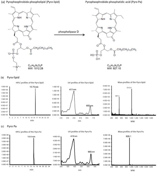 Pyropheophorbide-phosphatydic acid (Pyro PA) was synthesized and provided by Professor Zheng (Toronto, ON, Canada). Forty mg of pyropheophrobide-phospholipid (Pyro-lipid) was suspended in 3 mL of sodium acetate buffer (40 mM sodium acetate, 80 mM CaCl2, pH 5.0) and sonicated for 5 min for efficient dispersion, after which 3 mL of diethyl ether and 1000 U of phospholipase D obtained from S. chromofuscus were added. The mixture was light sensitive and therefore was protected from light and mixed aggressively at 33 °C. The reaction was completed in 5 h to yield Pyro PA, evidenced by HPLC-MS analysis. The HPLC profiles of the Pyro-lipid and Pyro PA and their corresponding UV spectra and mass spectra were further examined and verified to ensure the success of the synthesis.