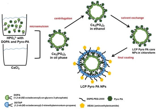 Novel synthesis method of LCP Pyro-Pa nanoparticles. LCP Pyro-Pa NP was composed of a biodegradable calcium phosphate core stabilized using DOPA and DOTAP. The outer layer of lipid was modified with polyethylene glycol (PEG) chains and aminoethylanisamide.