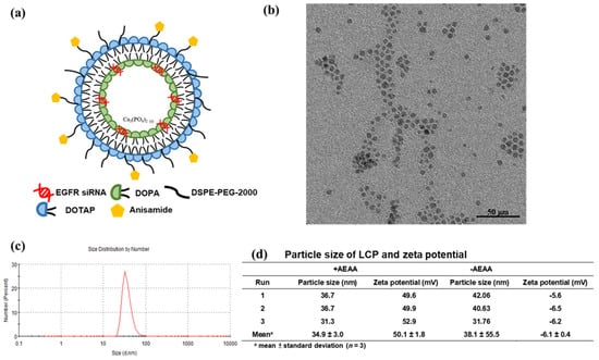 Refer to the similar descriptions shown above for LCP-Pyro PA NPs (Figure 3a). As TEM was conducted in dehydrated conditions, it showed nanoparticle sizes ranging from 25 to 30 nm. The LCP NP sizes detected by dynamic light scattering technology were larger than the TEM-measured NP sizes, from 31 to 37 nm, because of the hydrodynamic diameter. The zeta potential for LCP siEGFR NPs was 50.1 ± 1.8 mV with AEAA and −6.1 ± 0.4 mV without AEAA. Data were presented as mean ± SD (in triplicate) (Figure 3b–d).
