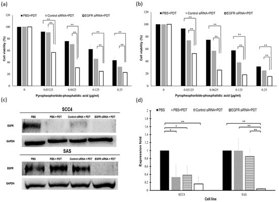 In vitro study of combined therapy. Combined therapy of EGFR siRNA or Control siRNA and photodynamic therapy (PDT) with different concentrations of Photosan photosensitizers in SCC4 (a) or SAS (b) cell lines. (c,d) Western blots of EGFR protein level in siRNA treated SCC4 and SAS cells. Columns, mean (n = 3); * stands for p < 0.05 compared to PBS group. ** stands for p < 0.01 compared to PBS group.