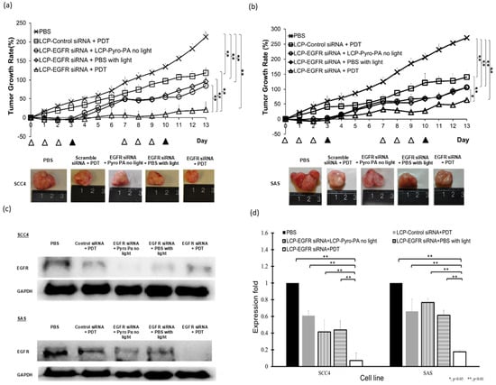 Quantitative RT-PCR and Western blot tests were conducted to examine SCC4 and SAS tumor tissues obtained on the 13th day. Protein expression of EGFR for LCP siEGFR NPs groups decreased significantly (p < 0.01). All data were analyzed and normalized with GAPDH densities when compared with PBS and LCP siControl+PDT groups for SCC4 and SAS xenograft models (Figure 5c). EGFR expression was consistent with assayed siEGFR mRNA expression for SCC4 or SAS xenograft animal models (Figure 5d) and significant differences (p < 0.01) were found in LCP siEGFR NPs compared with PBS and the three other treated groups.